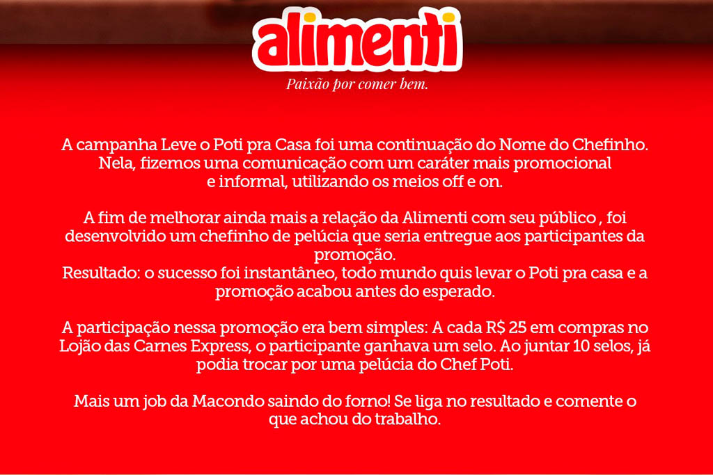 A campanha Leve o Poti pra Casa foi uma continuação da Campanha Nome do Chefinho. Fizemos uma comunicação com um caráter mais promocional e informal, utilizando os meios off e on.
